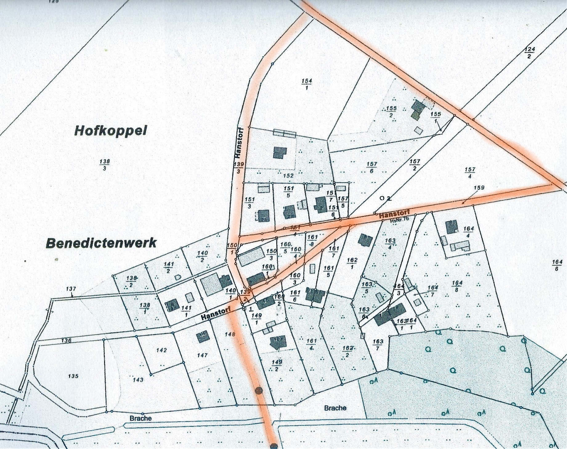 Erst als das Flurstück 154/1 an das Grundstück unseres Siedlerhauses "Hanstorf 1" zurück gelangte und wir einen Antrag auf Wiedereinrichtung der "Dorfstraße" als Fuß- und Wanderweg stellten, wurde das Amt Grevesmühlen auf diese "Landnahme" aufmerksam. Aber anstatt den Anwohnern des Dorfes einen Spazierweg einzurichten, beeilte sich der Bürgermeister, Peter Koth, die 812 m² an einen Landwirt zu verpachten.